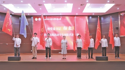 | 贵州大学党委书记杨未为社会实践活动学生团队代表授旗。 |