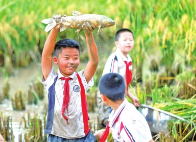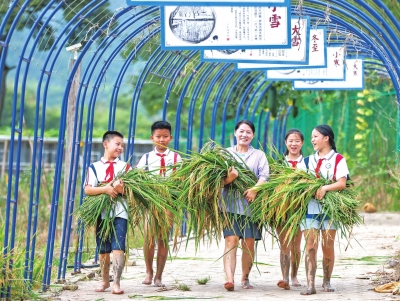 黔东南苗族侗族自治州施秉县第四小学日前在校园“童心农场”开展“庆丰收”劳动教育实践活动。同学们在老师的指导下,用传统的方式收割稻谷,学习农耕文化的同时,体验劳动与丰收的喜悦。