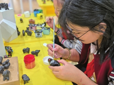 陶艺区内,另一位同学正低头为陶坯上色,她轻声解释道:“我把它做成小鸟的形状,接下来要画上羽毛和翅膀。”