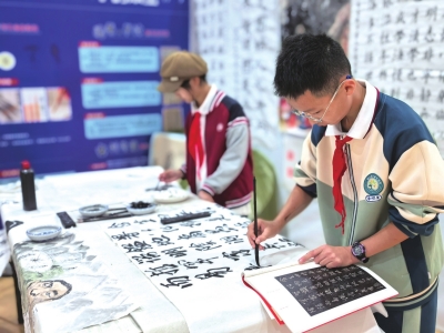 汇演结束后,游园体验区迅速热闹起来。书法展区墨香四溢,画具展区色彩纷呈,桥梁文化展区则融合了工程思维与美学设计。尤其吸引人的是漆扇制作与陶艺上色等非遗体验项目,展位前很快排起长队。