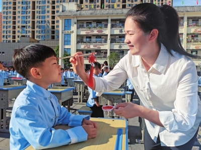 活动在“正衣冠”环节中正式开启。学生们依次进行自正衣冠、互正衣冠和师正衣冠,寓意以整洁端正的仪容迎接新的求学旅程。随后进行的“朱砂启智”环节中,学校领导与教师为新生轻点朱砂,寄托了对孩子们智慧开启、心明眼亮的美好祝愿。