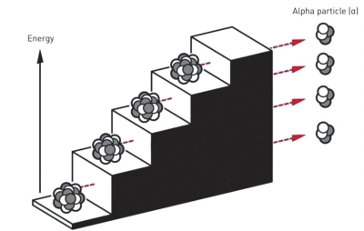 单个粒子发生隧穿的现象,其实早已为人所知。1928年,物理学家乔治·伽莫夫意识到,正是隧穿效应导致某些重原子核以特定方式发生衰变。原子核内部各种力的相互作用在其周围形成了一道势垒,将内部粒子束缚其中。然而,尽管存在这道势垒,原子核的一小部分仍有时能分裂出来,穿过势垒逃逸出去,从而使原来的原子核转变为另一种元素。如果没有隧穿效应,这类核衰变就不可能发生。