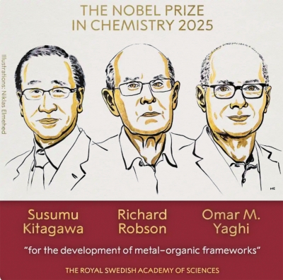 | 2025年诺贝尔化学奖授予北川进、理查德·罗布森以及奥马尔·M·亚吉。图/诺贝尔奖委员会官网 |