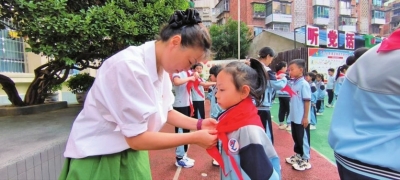 党员老师系上的是初心与信仰,团员老师系上的是责任与担当,孩子们胸前飘扬的是未来与希望。当鲜艳的红领巾在新队员胸前飘扬,稚嫩的脸庞上写满自豪。大队辅导员在队旗下带领新队员宣誓,“高举队旗跟党走”的信念随着誓言深深镌刻在孩子们心中。