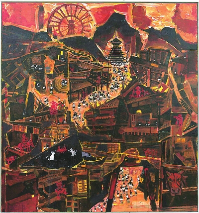 | 《古寨烟火盛》 (油画) 贵州民族大学美术学院 张逸娜 指导老师:杨洪文 |
