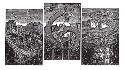 | 《舞龙盛景·古韵传承》 (黑白木刻) 贵州民族大学美术学院 刘雯锦 指导老师:刘盛玲 |