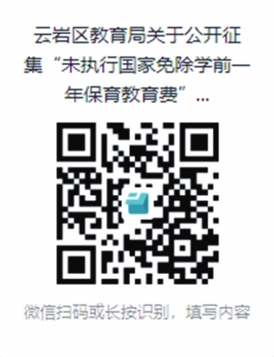 本报讯(记者 潘国虎)为落实国家免除学前一年保育教育费政策的实施,确保每位符合减免政策的适龄幼儿真正享受国家优惠政策,日前,云岩区教育局特向广大家长征集“未执行国家免除学前一年保育教育费”幼儿园的问题反馈。