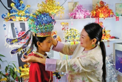 10月15日,河北省衡水市37岁宝妈王媛娇正在用废弃的易拉罐制作流光溢彩的珠饰凤冠。王媛娇说,去年整理阳台时,家里攒下的空易拉罐让她犯愁,恰逢女儿念叨 《红楼梦》 里王熙凤的凤冠,她当即绘图剪裁,用一周时间制成了女儿的“专属凤冠”。女儿开心不已,开始学着和妈妈一起用废易拉罐制作各种头饰。