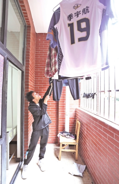 | 季宇航在寝室自己晾晒衣服。 |