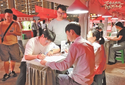 来自贵州万事通房地产经纪有限公司的店长吴洪康几乎没歇过脚。“今晚咨询我们岗位的大概有一百人。”他说,公司提供销售、金融等岗位,“薪资是底薪加提成,提成最高可达70%,收入弹性很大。夜间招聘会的效果超出预期,我们遇到了很多优质人才。”