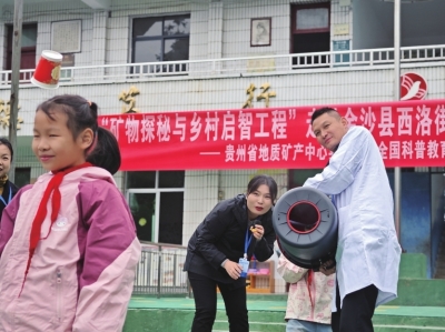 本报讯(特约通讯员 王杰 毛永富 贾双琳)10月23日下午,毕节市金沙县西洛街道申家街小学迎来一群特殊的客人——贵州省地质矿产中心实验室党委委员、副主任、正高级工程师周万峰一行,他们带来了成箱的实验器材和丰富的学习用品,为农村孩子带来了一场科普体验盛宴。此次活动是“2025年度贵州省基层科普行动计划项目”——矿物探秘与乡村启智工程进农村、进校园系列活动之一,通过四类科普活动,将科学家精神宣讲、科普剧展示、科普讲座、青少年互动活动送进农村校园。