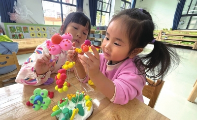 美工区域里,孩子们化身“小小设计师”。他们手握彩纸、黏土与画笔,全神贯注地制作贺卡和花束。每一笔勾勒、每一帧创作都满含童真与爱意,只为给食堂阿姨们送上一份独一无二的惊喜。