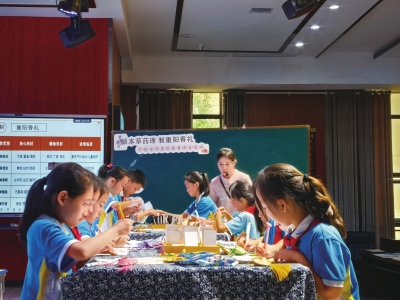 小学课堂“守正创新”,让传统文化“生根发芽”。包丽莎老师的《循本草药理,制重阳香礼——传统技艺里的香囊养生密码》,将中医药文化融入劳动实践:四年级学生辨识中药材、搭配香料、缝制香囊,在一针一线中领悟“天人合一”的生活智慧,实现劳动与健康教育的有机融合;杨婷婷老师的 《做束花儿送妈妈》 则以母亲节为情感纽带,指导学生用皱纹纸、绿胶带制作康乃馨,让劳动成果成为感恩的载体,在提升手工技能的同时,悄然播下德育种子。四节示范课虽主题不同,却均以“实践”为核心,为参训教师提供了可复制、可推广的教学范例。
