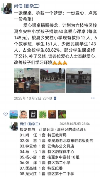 接到统计数目的当天晚上,尚任在他的个人朋友圈里发布为安柱小学捐赠课桌椅的捐赠接龙,附言:一张课桌,承载一个梦想,一份爱心,点亮一份希望。