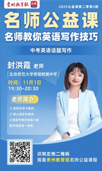 英语话题写作能力如何提升?考场上如何高效分配写作时间?11月1日(星期六)19:30~20:30,《贵州教育报》联合北京师范大学贵阳附属中学初中部,共同开启的第二季名师公益课主科专场,第三期的课程将特邀北京师范大学贵阳附属中学的封洪霞老师,聚焦中考英语写作核心痛点,带来“中考英语话题写作突破”专题指导,助你打通写作提分关键堵点!