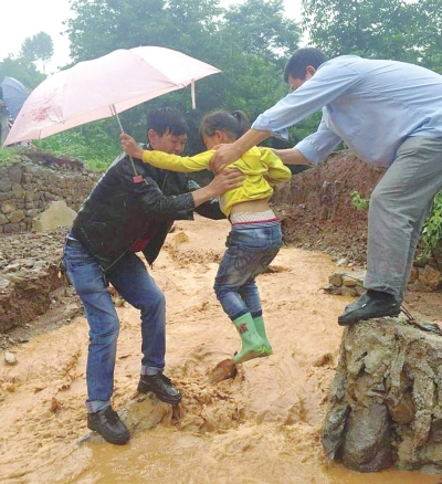 | 下雨天郑龙 (左一) 送孩子回家。 |
