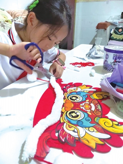 在教师与家长的共同指导下,学生利用课余时间查阅资料、绘制草图、动手制作,不仅创作出皮影、纸鸢、脸谱、醒狮挂件、节气饰品等丰富多彩的作品,还亲手撰写“文化小注解”,在实践过程中融汇知识学习、艺术创作与劳动体验,实现“做中学、学中悟”。