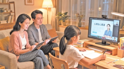 | 家长陪同孩子一起上网络心理直播课(AI生成) |
