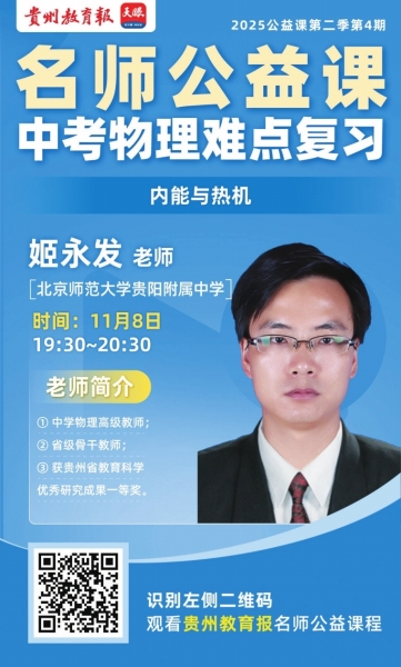 内能与热机专题如何有效提分? 考试中常见丢分点该如何规避?11月8日(星期六)19:30~20:30,《贵州教育报》联合北京师范大学贵阳附属中学初中部推出的第二季名师公益课主科专场,将特邀该校资深物理名师姬永发,带来“中考物理‘内能与热机’专题突破”公益讲座,聚焦核心痛点,拆解失分关键,为初三学子助力高效备战中考。