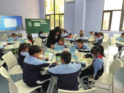 走进萃元小学校园,未来教室内,一场别开生面的英语课正在上演。英语老师滕雨媛轻点智能设备,生动的教学画面瞬间呈现在孩子们眼前。孩子们则熟练地运用手中的平板电脑,踊跃答题、积极抢答,课堂气氛热烈非凡。这便是萃元小学智慧课堂的一个缩影。