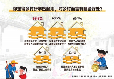 乡村研学“热”起来,也给乡村带来了许多生机。调查显示,69.8%的受访者认为乡村研学能让乡村传统手工艺、民俗文化被更多人知道并传承下去;63.9%的受访者认为能促使乡村优化环境,基础设施更好了;60.7%的受访者表示乡村研学给当地带来了人气和消费,帮老乡们增加了收入。其他还有:给当地年轻人创造了新的工作机会(46.1%)、让城市里的人更了解乡村,提升地方的知名度(42.1%)等。