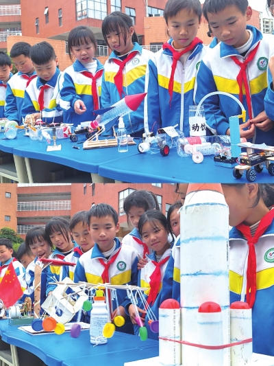 演讲台上,小选手们化身“科技小主播”,畅谈未来发电房、省力小发明、飞行汽车,眼里闪着星光,5分钟的分享道不尽对科学的热爱。静态展区堪称“创意宝藏屋”:一二年级树叶贴画萌趣十足,落叶拼兔、花瓣堆阳;三四年级科幻画脑洞大开,飞行校车、海底学校栩栩如生;五六年级手工科技作品硬核吸睛,旧纸盒收纳机器人、电池马达扫地机实用又精巧,科技小论文里满是观察智慧。