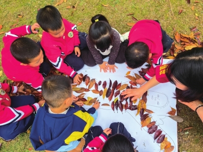| 孩子们将落叶拼成图画。 |