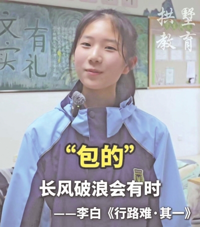 “我们六位同学各自选了感兴趣的网络词汇,再去搭配对应的古诗。”参与活动的万王钰同学介绍,她当时认领的热词是“包的”,立刻就想到了李白“长风破浪会有时,直挂云帆济沧海”的诗句。