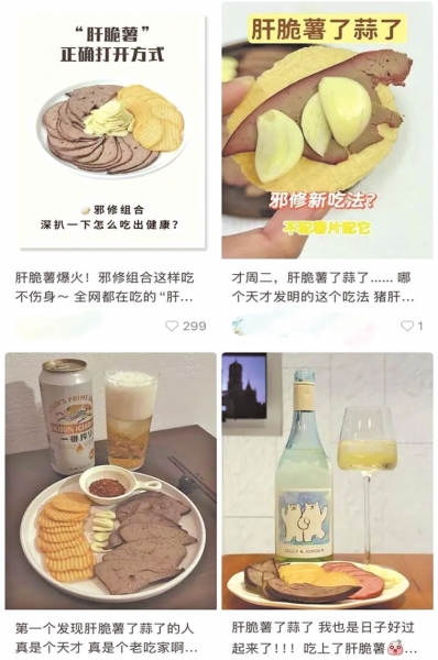 最近,一种被网友起名为“肝脆薯了蒜了”的零食组合爆火。在不少视频中,博主们将搭配好的卤制猪肝、酥脆薯片与辛辣生蒜片,混合在一起食用,连连表示“上头”“绝配”。