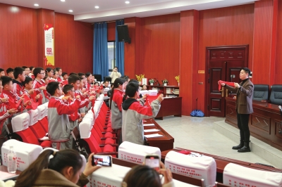 | 江任宏带领学生手持红领巾随乐而动。 |