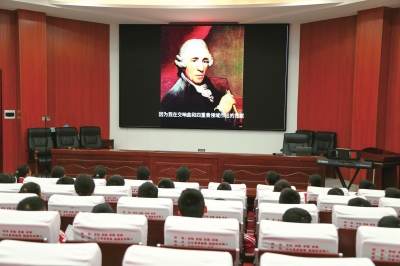 本次活动的核心环节是江任宏老师执教的 《惊愕交响曲》 示范课。课堂伊始,江老师以趣味律动游戏巧妙破冰,学生们手持红领巾随乐而动,并在乐曲力度突强的“惊愕”瞬间将红领巾抛向空中,瞬间点燃了学习热情。课上,他通过“cosplay音乐家”、播放可视化动画等方式,生动讲述了“交响曲之父”海顿的生平与作品的创作轶事,引导学生深入理解古典音乐的幽默与魅力。
