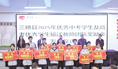 本报讯(记者 廖尚海 特约通讯员 尹长琼)11月11日,黔东南州三穗县举行2025年优秀中考学生及高考优秀学生输送教师团队奖励金发放仪式,向该县优秀学生、优秀学生输送教师团队及备课组团队共发放了32万元奖金。