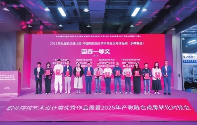 本报讯(记者 罗欢)11月16日,在广州举行的“教育部职业院校艺术设计类优秀作品展暨2025年产教融合成果转化对接会”上,第九届“米兰设计周——中国高校设计学科师生优秀作品展”国赛奖项正式揭晓。贵州交通职业大学王波、胡晓雷两位教师双双斩获职教赛道教师组一等奖,其中王波老师以全场最高分荣登一等奖榜首。