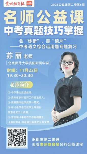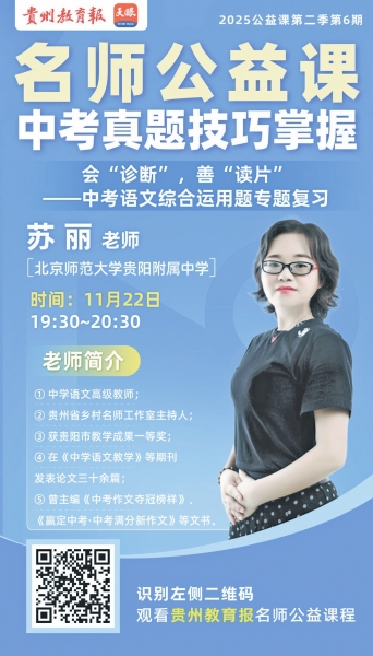 还在为中考语文综合运用题的灵活题型发愁?15分的分值如何稳稳拿捏?11月22日(星期六)19:30-20:30,《贵州教育报》联合北京师范大学贵阳附属中学初中部推出的第二季名师公益课主科专场,将迎来第六期重磅课程。北师大贵阳附中中学语文高级教师、贵州省乡村名师工作室主持人苏丽将带来“中考语文综合运用题专题复习”直播,以“诊断式”教学法拆解解题技巧,助力初三学子跳出备考误区,实现从“会做”到“拿高分”的突破。
