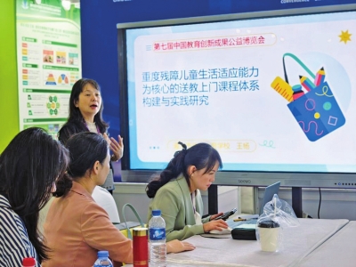 在教博会工作坊汇报现场,项目主持人详细阐释了课程体系的实践路径与创新价值:该成果突破了传统送教上门课程碎片化、单一化的局限,以“综合性教育活动”为载体,实现了残障儿童独立性、社会融合与潜在生产力的协同发展。这一探索不仅加速了重度残障儿童送教上门课程系统化建设步伐,也为促进教育公平提供了可复制的实践样本。