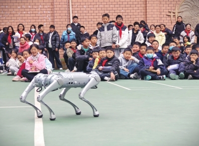 紧接着,一场精彩绝伦的科学表演秀将活动推向第一个高潮。机械狗灵活奔跑,仿生蝴蝶翩翩起舞——这些由贵阳学院与乐博科技培训学校带来的特邀节目,让学生们目不转睛,初二(5)班的汪发栋梁说,这么近距离地观看机械狗表演让他印象深刻,也拓宽了眼界,直呼“太酷了!”