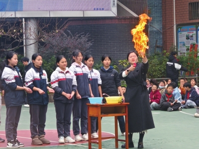 物理化学老师们带来的实验表演同样引爆全场。张秀美老师的“赤手传火”让火焰在手中安全舞动;刘媛老师的“大象牙膏”喷涌出彩色泡沫;李丹洋老师的“水火箭”冲天而起;陈勇老师的“大气压强拔河”展现了无形的力量;文小红老师组织的“百人静电”让人直观感受静电的“威力”……每一个节目都引来阵阵惊呼,激发着学生们求知和探索的欲望。物理老师文小红说:“这样的课堂更能调动和激发孩子们的参与感,不仅是知识的提升,更是动手能力、团队协作的锻炼,对孩子们,尤其是即将面临中考的初三学生来说,身心上都有非常大的帮助。”