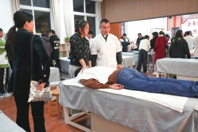 在实地参访环节,苏世民书院师生参观了唐人坊非遗学院实训室、盲人学院实训室、微笑广场等多个教学与实践场所。师生们走进盲人学院,与视障学生亲切互动,并亲身体验了盲人按摩技艺;随后分组进入不同班级开展英语教学,讲授日常问候、问路指引等实用表达。