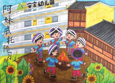 画面中央,身着阿妹戚托特色蓝红服饰、头戴花饰帽的小朋友们手拉手起舞,活泼的神态里藏着民族歌舞的灵动。背景一侧是明亮的幼儿园建筑,另一侧是贵州特色的青瓦木楼,搭配明艳的向日葵与绿植,展现了孩子们的快乐日常。