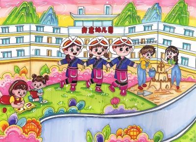 这幅作品展现非遗舞蹈“阿妹戚托”的童趣传承。在幼儿园的乐园里,小朋友们穿上漂亮的彝族衣裳,手拉手跳起阿妹戚托舞。看,身后的幼儿园像座小城堡,周围的大山绿油油的。还有小伙伴在画画、堆沙堡,多热闹呀!