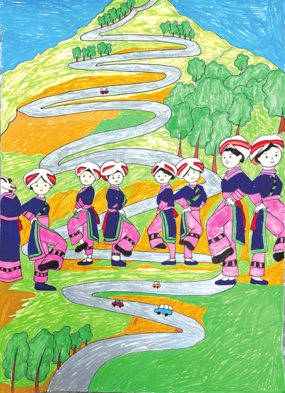 画中蜿蜒二十四道拐间,彝族姑娘展现出的“阿妹戚托”舞蹈成了最亮眼的风景。她们身着蓝粉传统服饰,舞步间脚掌轻擦地面、脚跟轻快叩击,用“东方踢踏舞”独有的细腻踢踏动作,与道路的盘旋曲线形成奇妙呼应,展现了彝族文化魅力。