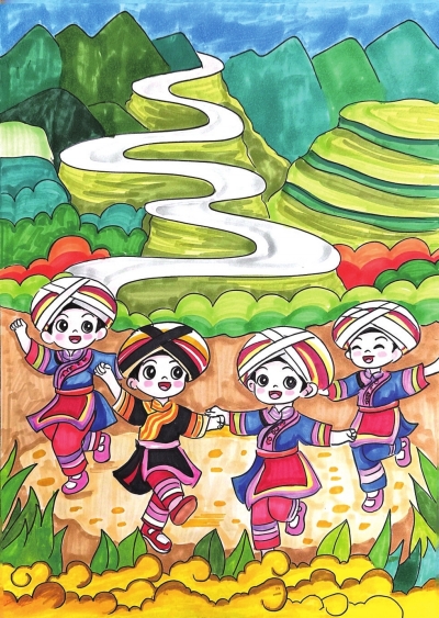 画中孩子们在大山脚下挥手、跳跃、牵手,传递出欢快互动的情绪,展现民族生活场景。以彝族文化与自然风光为核心,传递出欢乐祥和的氛围。