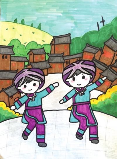 这幅画聚焦彝族非遗“阿妹戚托”,以身着传统彝装的少女为核心,搭配青山、彝寨与乡路的背景,既呈现舞蹈“踏地而歌”的灵动,也还原其发源地的乡土风貌,传递这一民俗舞蹈里的生活温情与文化生机。