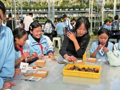 在基地的研学课程中,“兜兰精灵寻找之旅”环节趣味盎然。同学们漫步于温室兰花展区,近距离观察兜兰、文心兰、石斛兰等30余种珍稀兰花,细致记录花朵的色彩、形态与芬芳,同时认真聆听老师讲解兰花与昆虫的共生奥秘。大家还依据研学手册推进进阶任务,主动探寻特殊植物并详实记录科学发现,顺利完成任务的同学均获得了“兜兰”纪念贴纸。