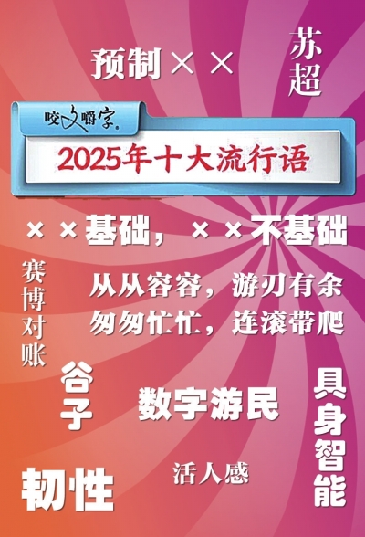 12月2日,《咬文嚼字》编辑部发布2025年十大流行语,韧性,具身智能,苏超,赛博对账,数字游民,谷子,预制XX,活人感,XX基础、XX不基础入选。火遍华人圈的“从从容容、游刃有余,匆匆忙忙、连滚带爬”也位列其中。
