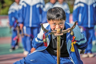 课间时分,高酿镇中学的操场上学生们闻鼓而动。他们手持状如弯月的月牙镋,转身、扫镋、对打,一招一式,刚柔相济。学生们扑、拿、击、刺,动作威猛,虎虎生风。这集武术与舞蹈于一体的表演,赢得了围观者的阵阵喝彩。