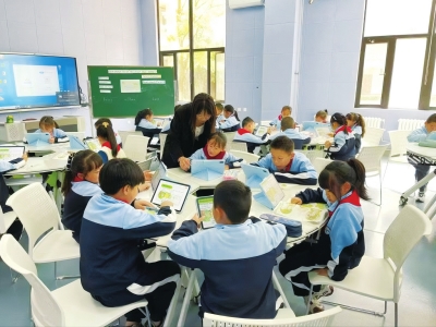 在萃元小学,记者见证了一堂充满科技感的英语课。教师滕雨媛轻触智能大屏,课堂资源瞬间展现在孩子们面前,学生通过平板实时抢答、互动,课堂氛围持续高涨。这所学校已将智慧课堂融入所有学科,通过图像、动画、VR等方式呈现教学内容。