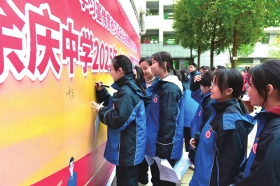| 师生们在横幅上签名。 |