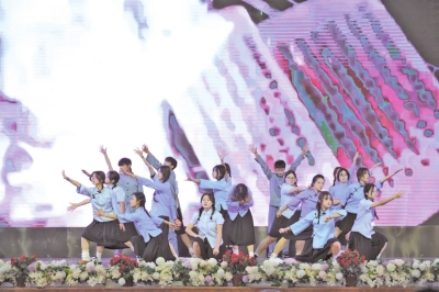 在《觉醒年代》舞台剧中,师生共同“回到”激情奔涌、理想炽热的年代,体悟先驱者如火的热情、坚定的信仰与无畏的担当;《英雄时代》朗诵以铿锵之声致敬革命先烈,提醒青年铭记和平背后的牺牲与付出;《映山红》歌曲以饱含深情的旋律,承载着对历史的敬意、对先辈的缅怀与对家乡的热爱,引领现场师生穿越时空,回到那段激情燃烧的岁月;《星星之火》舞蹈以肢体语言再现革命者的赤诚与坚守,展现改天换地的豪情力量。
