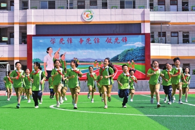 环境之美更需人文滋养。印江三小运动场北侧的“学先锋、争先锋、做先锋”主题墙画格外醒目,画面中师生行礼致敬的庄重与运动嬉戏的活力相得益彰。